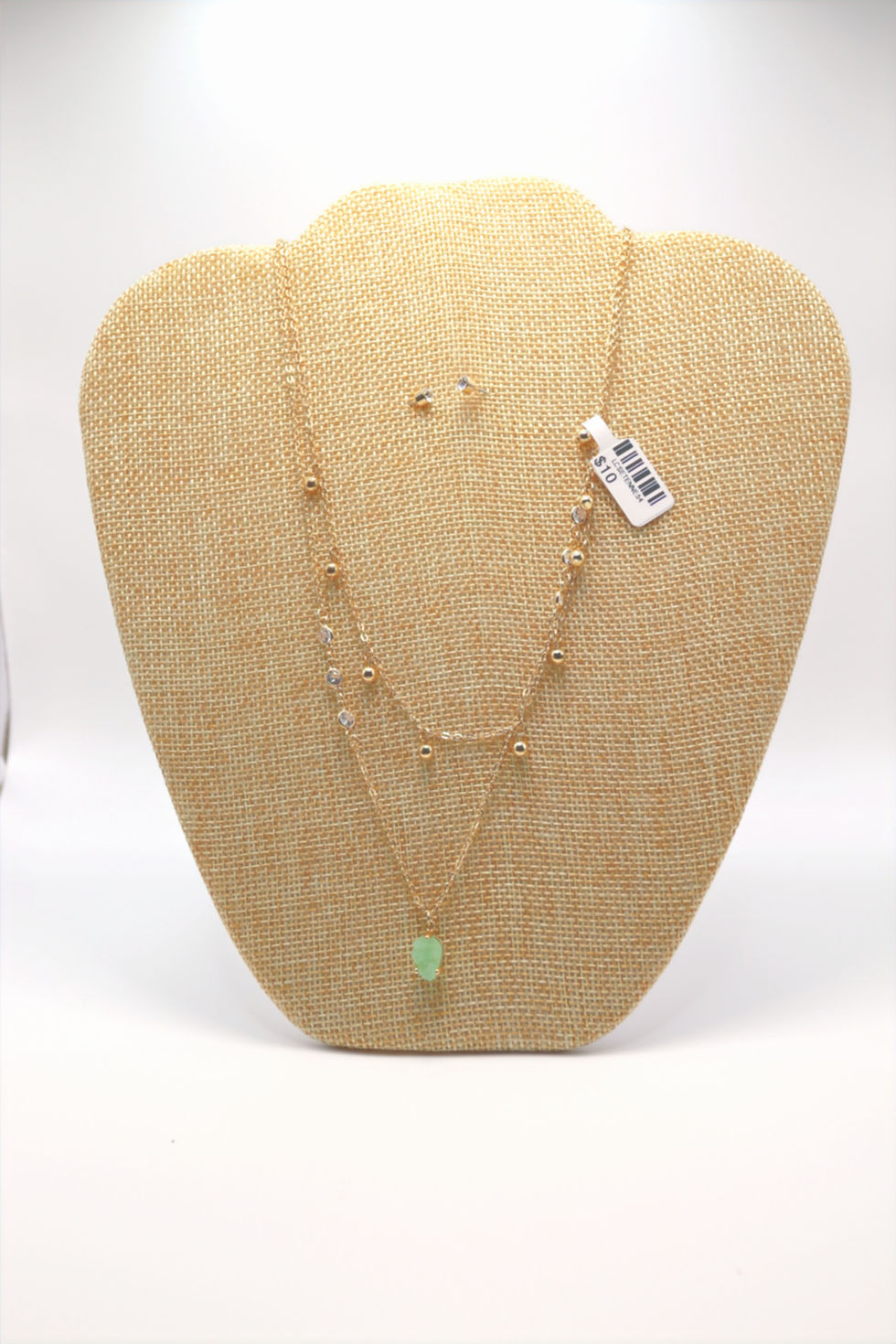 LCNECK-NE54 - Set Rhinestone Earrings & Necklace Gold colored W/Green Stone
